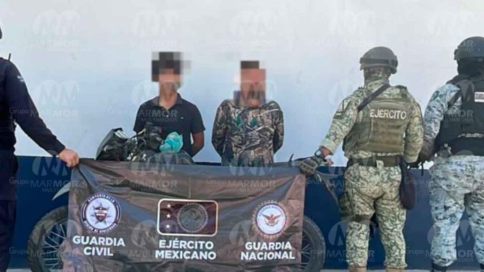 Los agentes de la Guardia Civil en conjunto con el Ejército Mexicano y la Guardia Nacional, detuvieron a dos personas del sexo masculino, de 20 y 44 años de edad respectivamente, cuando transitaban cerca de la localidad de Gámbara a bordo de una motocicleta de la marca Italika.