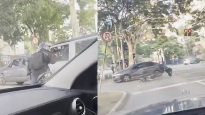 Un motociclista protagonizó una escena que parece sacada de una comedia irónica, pero con consecuencias reales. En un video viral, se observa cómo el conductor de una motocicleta detiene su marcha junto a una Jeep para iniciar una discusión agresiva, que incluye gritos y golpes al vehículo.