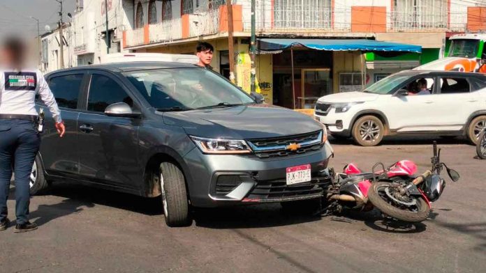Morelia, Mich.- Viernes 09 de mayo de 2025.- Un automóvil y una motocicleta protagonizaron un choque sobre la avenida Escuadrón 201 y/o Décima, en la zona poniente de Morelia, hecho que dejó levemente lastimado al motorista, comentaron fuentes policiales.