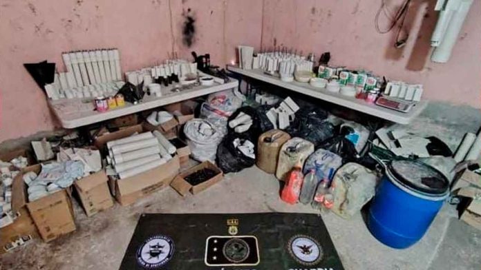De igual forma dentro del domicilio, agentes estatales y federales decomisaron tres máscaras para soldar, dos taladros de banco, diversos materiales de metal como tubos y placas, así como bidones con líquidos similares a la gasolina, thinner y ácido.