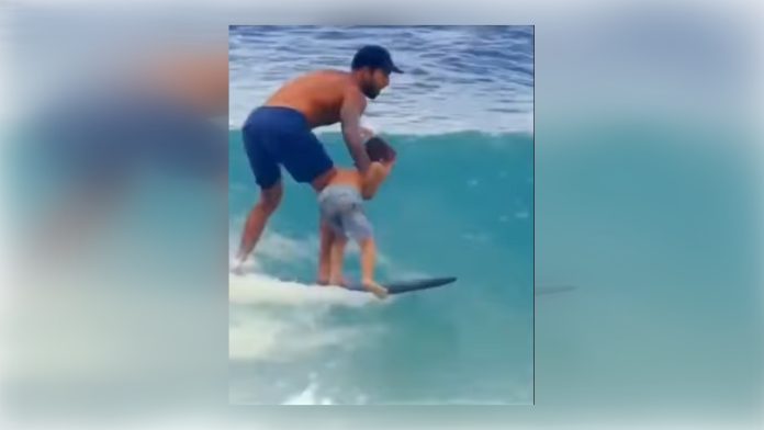 El padre espera el momento justo, cuando la ola se forma con ritmo sereno y fuerza amable, una que no solo arrastra agua, sino también sueños. Entonces lo coloca de pie sobre la tabla. El niño, con el viento en la cara y el corazón palpitando, siente por primera vez el impulso del mar llevándolo.
