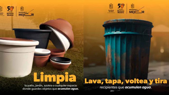 Morelia, Michoacán, 8 de junio de 2025.- La Secretaría de Salud de Michoacán (SSM) trabaja de la mano con la población a través de la estrategia de conservar los patios delas casas limpios, con la estrategia lava, tapa, voltea y tira, botes, botellas, llantas, cubetas, pilas, piletas y todo aquello que acumule agua y se pueda convertirse en criadero del mosco Aedes Aegypti, transmisor del dengue, zika y chikungunya.