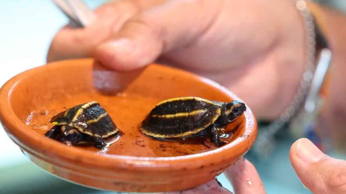 Las crías, apodadas “Tric” y “Trac”, nacieron el 19 de mayo y el 1 de junio de 2025, con pesos de 9,64 y 8,89 gramos, respectivamente. Estas tortugas, de caparazón oscuro con tres líneas amarillas, alcanzarán unos 20 centímetros y cerca de un kilo en la edad adulta. Su sexo se determinará en cinco o seis años.