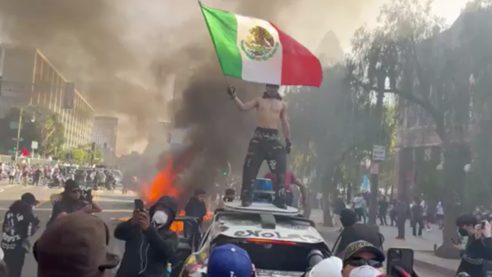 “Queremos libre a David Huerta, y queremos que las redadas de ICE (el Servicio de Inmigración y Aduanas) se frenen ahora”, declaró Jaime Contreras, el líder del sindicato de trabajadores de servicios (SEIU).