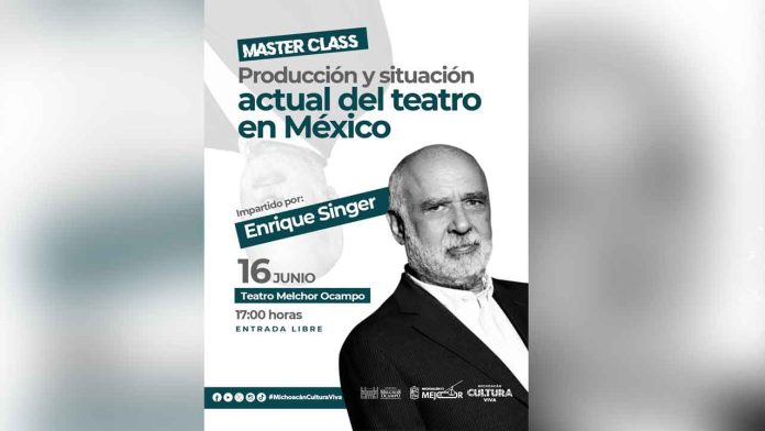 Morelia, Michoacán, 13 de junio de 2025.- La Secretaría de Cultura de Michoacán (Secum) invita a la comunidad artística y al público en general a la clase magistral que ofrecerá el reconocido actor y director Enrique Singer, este lunes 16 de junio a las 17:00 horas en el Teatro Ocampo. La entrada será gratuita.