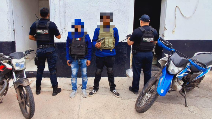 Durante el desarrollo de patrullajes de vigilancia en la localidad de Santa Clara, los elementos de la Guardia Civil aseguraron a los ahora indiciados, a quienes les decomisó un arma de fuego calibre .380 milímetros, cinco cartuchos útiles, un cargador, equipo táctico y dos motocicletas marca Italika.