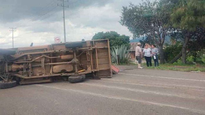 Morelia, Mich.- Martes 17 de junio de 2025.- La tarde de este martes se registró la volcadura de un camión de carga sobre la carretera Morelia-Pátzcuaro, incidente que sólo dejó daños materiales, indicaron autoridades policiales .