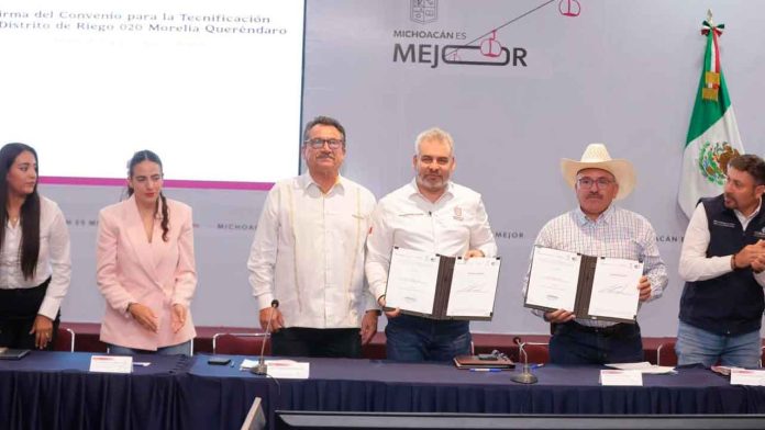 Morelia, Michoacán, 19 de junio de 2025.- El gobernador Alfredo Ramírez Bedolla firmó un convenio con la Comisión Nacional del Agua (Conagua) para tecnificar los módulos de riego II, III y IV del Distrito de Riego 020 Morelia-Queréndaro con una inversión de 220 millones de pesos.
