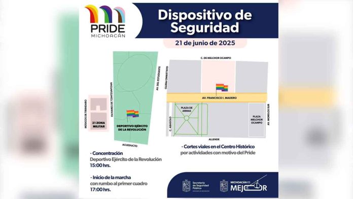 “Acompañaremos la marcha del orgullo LGBTTTIQ+ en Morelia, este sábado 21 de junio: 11:00 am – Cierre del primer cuadro del Centro Histórico por colocación de escenario; 3:00 pm – Congregación de personas y vehículos; 5:00 pm – Inicia el recorrido sobre la avenida Francisco I. Madero. Toma precauciones #MichoacánEsMejor”, se señala en la publicación.