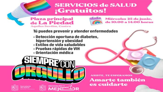 Morelia, Michoacán.- La Secretaría de Salud de Michoacán (SSM) llevará sus actividades y servicios de salud gratuitos a La Piedad y Zamora, continuando así con la conmemoración del Mes del Orgullo LGBTTTIQ+.