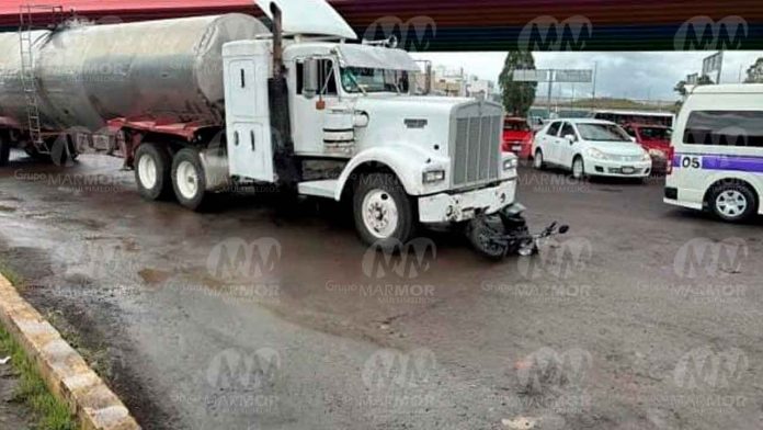 Morelia, Mich.- Martes 01 de julio de 2025.- Un tráiler chocó contra una motocicleta y la joven que la conducía resultó lastimada, afortunadamente no de gravedad. El hecho tuvo lugar en el Distribuidor Vial Salida a Charo, al oriente de Morelia, informaron fuentes policiales.