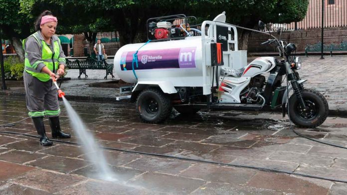 Morelia, Michoacán; 10 de julio de 2025.- El Gobierno Municipal que encabeza el presidente Alfonso Martínez Alcázar, puso en operación dos moto pipas para el mantenimiento de espacios públicos en el Centro Histórico de Morelia.