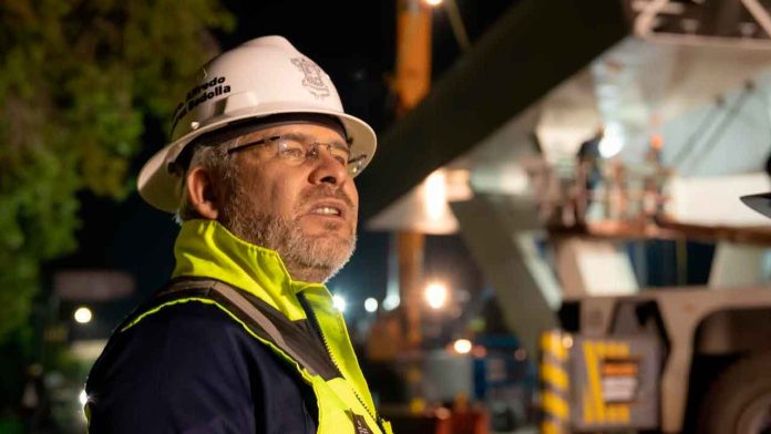Morelia, Michoacán, 15 de julio de 2025.- La construcción del paso superior vehicular Eréndira avanza en tiempo en las inmediaciones del Mercado de Abastos y, una vez concluido, contribuirá al ordenamiento del tránsito vehicular en la zona norte de Morelia, destacó el gobernador Alfredo Ramírez.