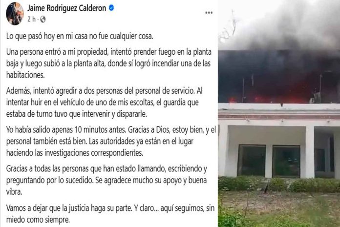 La tarde de este lunes, un fuerte incendio alarmó a vecinos del municipio de García, Nuevo León, al registrarse en la propiedad del exgobernador Jaime Rodríguez Calderón, mejor conocido como “El Bronco”. A través de redes sociales, el propio exmandatario estatal informó que un individuo ingresó a su domicilio y provocó el fuego de manera deliberada.