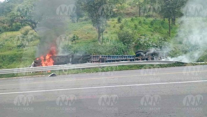 Michoacán.- 24 de julio de 2025.- En distintos puntos de la autopista Siglo XXI se registraron dos accidentes con camiones de carga involucrados, uno de ellos un choque y el segundo, una volcadura con posterior incendio.