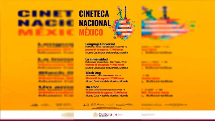 Morelia, Michoacán, 5 de agosto de 2025.- La Secretaría de Cultura de Michoacán (Secum), en colaboración con la Cineteca Nacional, invita al público a disfrutar de cuatro funciones gratuitas de la 77 Muestra Internacional de Cine, que se llevarán a cabo del 6 al 9 de agosto en el auditorio de la Casa Natal de Morelos, a las 17:00 horas.