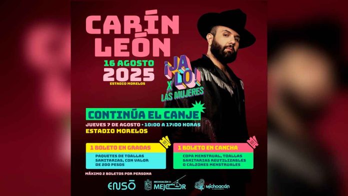 Morelia, Michoacán, 7 de agosto de 2025.- Hoy jueves comienza el tercer día de canje de boletos para el concierto de Carín León, que impulsa el Gobierno de Michoacán a través de la Secretaría de Igualdad Sustantiva y Desarrollo de las Mujeres, encabezada por Alejandra Anguiano González.