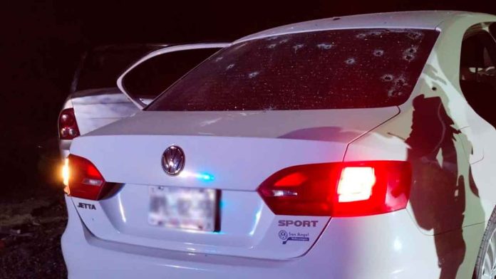 La noche de este lunes, las autoridades detectaron un auto Jetta de color blanco con placas NPL-8255 del estado de México, cuyos ocupantes dispararon en contra de los uniformados, quienes repelieron el fuego enemigo.
