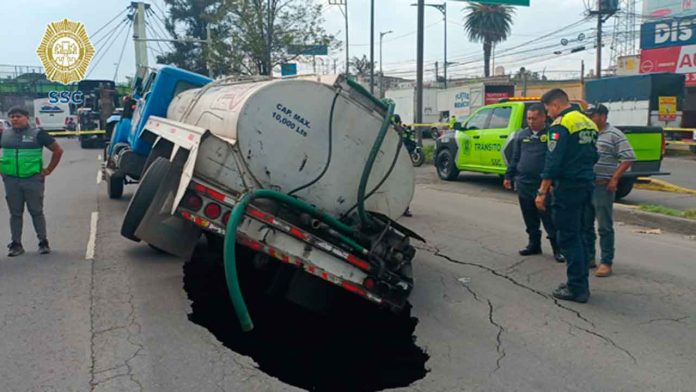 Ayer, oficiales de tránsito de la Secretaría de Seguridad Ciudadana (SSC) llevaron a cabo maniobras para retirar un vehículo que quedó afectado por un socavón en la Calzada General Ignacio Zaragoza, justo antes del Anillo Periférico al Poniente.