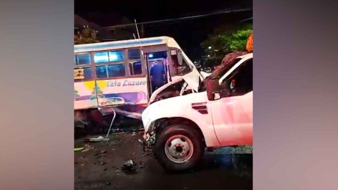 Uruapan, Mich.- 14 de agosto de 2025.- Por lo menos tres lesionados y cuantiosos daños materiales dejó como saldo un aparatoso choque entre una camioneta doble rodado y un camión urbano de la línea Tata Lázaro, sobre la Calzada Benito Juárez.