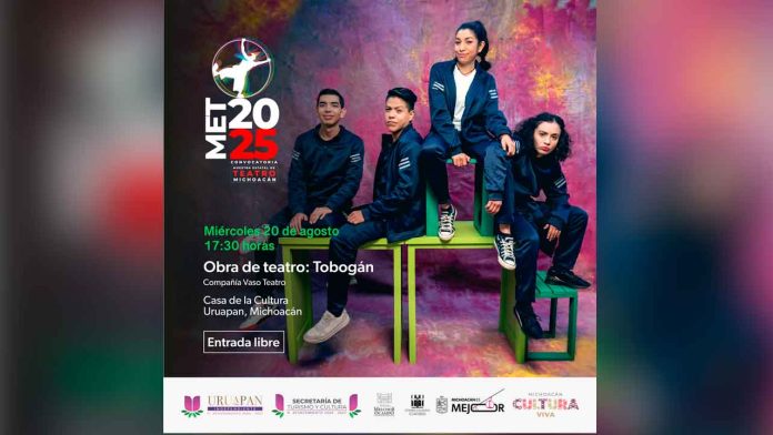 En Uruapan, la compañía Vaso Teatro presentará “Tobogán” a las 17:30 horas en la Casa de la Cultura. Dirigida a público mayor de 12 años, esta comedia reflexiona con humor sobre la adolescencia, los riesgos de la sexualidad irresponsable y las violencias que enfrentan las mujeres. Vaso Teatro, compañía fundada en 2010, se caracteriza por la creación de textos originales y cuenta con un sólido recorrido en festivales como la Muestra Nacional de Teatro Colima 2019.