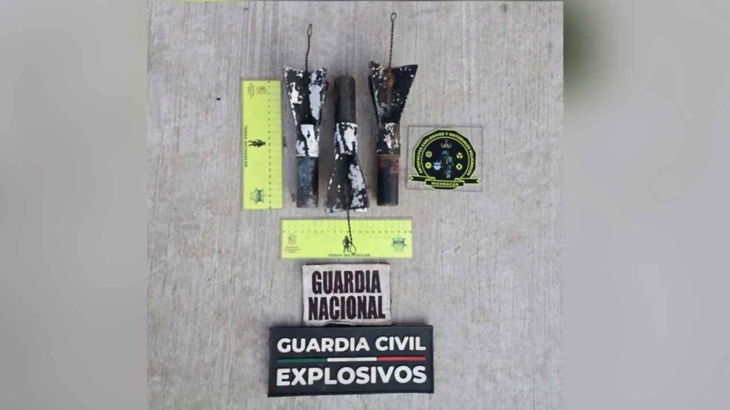 Uruapan, Michoacán, 20 de agosto de 2025.- Agentes de la secretarías de Seguridad Pública (SSP) y de la Defensa Nacional (Defensa) aseguraron y desactivaron tres artefactos explosivos que habrían sido fabricados para ser arrojados desde drones en la ciudad de Uruapan, esto en atención a un llamado de emergencia.