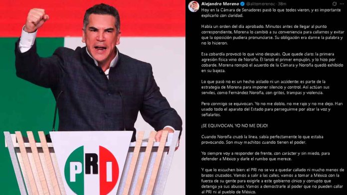 Alejandro Moreno “Alito” se pronunció a través de la red social X sobre los hechos ocurridos en el Senado, asegurando que antes de la confrontación existía un orden del día aprobado, pero que Morena lo modificó a último momento para silenciar a la oposición.