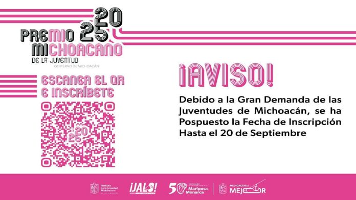 Morelia, Michoacán, 2 de septiembre de 2025.- El Instituto de la Juventud Michoacana (Ijumich) anunció el aplazamiento de la fecha de cierre de registro para el Premio Michoacano de la Juventud edición 2025, esto debido al gran interés y la amplia respuesta mostrada.