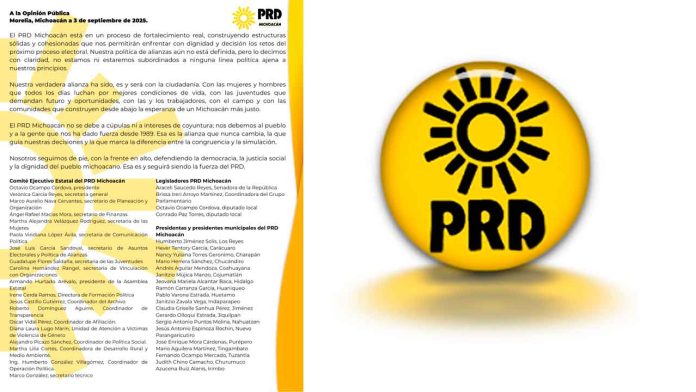 El PRD Michoacán anunció el cierre de filas de su militancia y dirigencia, con miras al próximo proceso electoral. En un posicionamiento público, el partido destacó que atraviesa un proceso de fortalecimiento real, basado en estructuras sólidas y cohesionadas, subrayando que su única y verdadera alianza ha sido, es y será con la ciudadanía.