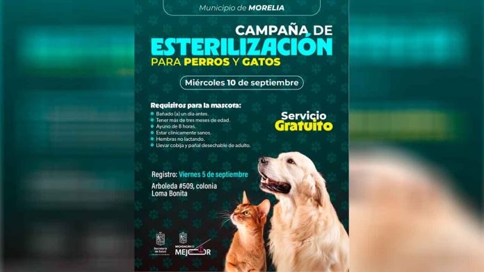 Morelia, Michoacán, 4 de septiembre de 2025.- La Secretaría de Salud de Michoacán (SSM), informa que el próximo miércoles 10 de septiembre se llevará a cabo una jornada de esterilización canina y felina gratuita, en la ciudad de Morelia.