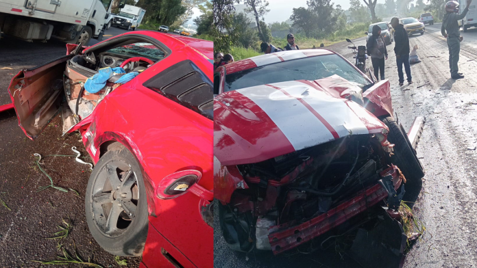 De acuerdo con los primeros reportes, el accidente tuvo lugar a la altura de la comunidad de Tacícuaro, donde un vehículo Ford Mustang GT de color rojo con franjas blancas, y matrícula PHY-223-A, tras chocar terminó sobre la carpeta asfáltica, con el frente destrozado.