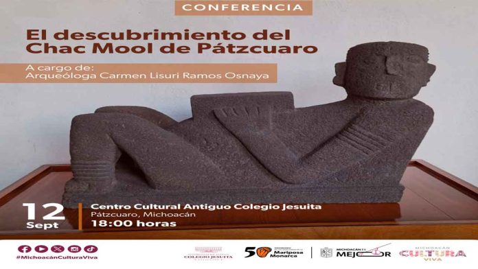Pátzcuaro, Michoacán, 11 de septiembre de 2025.- La Secretaría de Cultura de Michoacán invita a la conferencia “El descubrimiento del Chac Mool de Pátzcuaro”, que impartirá la arqueóloga Carmen Lisuri Ramos Osnaya, este viernes 12 de septiembre a las 18:00 horas en el auditorio del Centro Cultural Antiguo Colegio Jesuita de Pátzcuaro.
