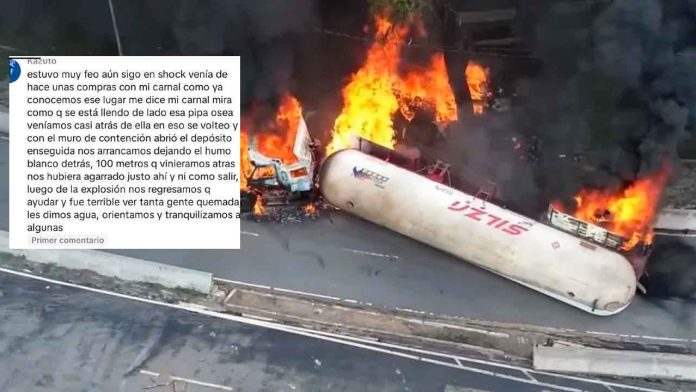 Testigo del incidente relato momentos de pánico. En un video difundido en redes sociales, un usuario narró: “Estuvo muy feo aun sigo en shock, Venía de hacer unas compras con mi carnal como ya conocemos ese lugar me dice mi carnal mira como que se está yendo de lado esa pipa. O sea, veníamos casi atrás de ella en eso se volteó y con el muro de contención abrió el depósito enseguida nos arrancamos dejando el humo blanco detrás”.