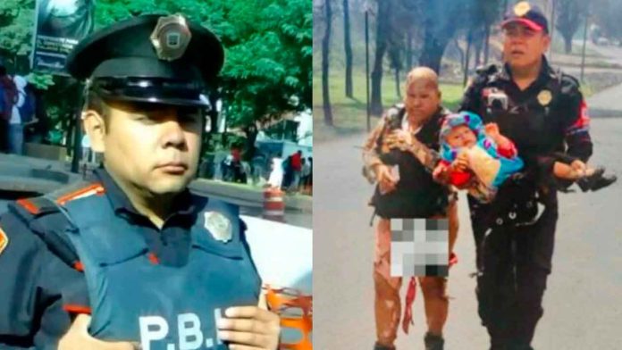 La heroína junto al policía capitalino fueron captados con la menor en brazos, y el oficial ayudó a trasladarla a un hospital para su atención médica.