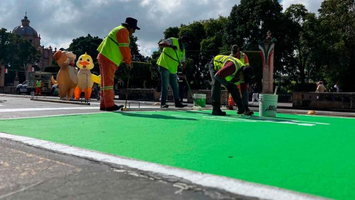 Las labores incluyen la aplicación de flechas de sentido, líneas divisorias, pasos peatonales y triángulos de prioridad ciclista, con el objetivo de fortalecer la seguridad vial, mejorar la movilidad y garantizar un entorno ordenado para las y los morelianos que asistirán a las celebraciones patrias.