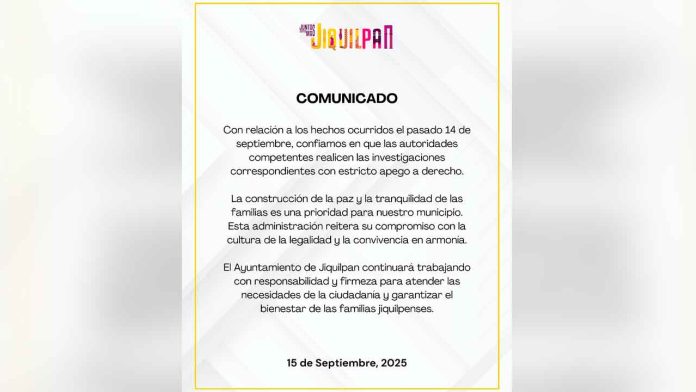 El H. Ayuntamiento de Jiquilpan, presidido por el Lic. Gerardo Olloqui Estrada, informa a la ciudadanía que, en relación con los actos ocurridos el pasado 14 de septiembre del presente año, manifiesta su plena confianza en que las autoridades competentes llevarán a cabo las investigaciones correspondientes para el esclarecimiento de los hechos.