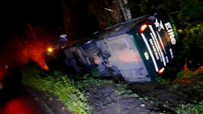 Tacámbaro, Mich.- Jueves 25 de septiembre de 2025.- La volcadura de un autobús de pasajeros dejó 12 personas lesionadas, esto sobre la carretera Villa Madero-La Parotita, dentro del municipio de Tacámbaro, indicaron fuentes policiales y de rescate.