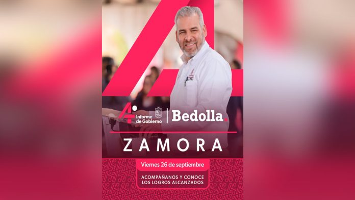 Morelia, Michoacán, 26 de septiembre de 2025.- Este viernes el gobernador Alfredo Ramírez Bedolla rendirá un informe regional en Zamora, donde destacará los avances que registra la administración estatal en diversos rubros como infraestructura carretera y obras hídricas.