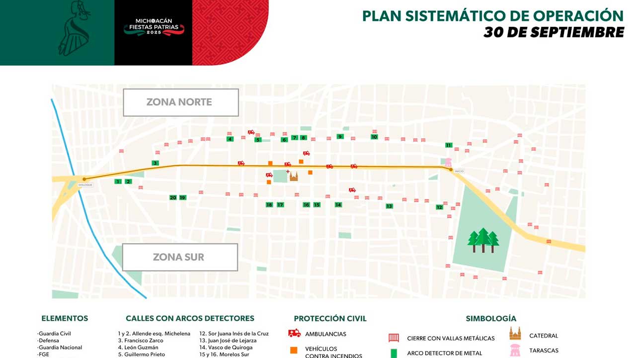 Morelia, Michoacán, 26 de septiembre de 2025.- En el marco del 260 Aniversario del Natalicio de José María Morelos y Pavón, la Secretaría de Seguridad Pública (SSP) establecerá un operativo integral de vigilancia, para garantizar el orden durante el desfile cívico militar del 30 de septiembre, con la habilitación de 20 puntos de acceso para el público que asista.