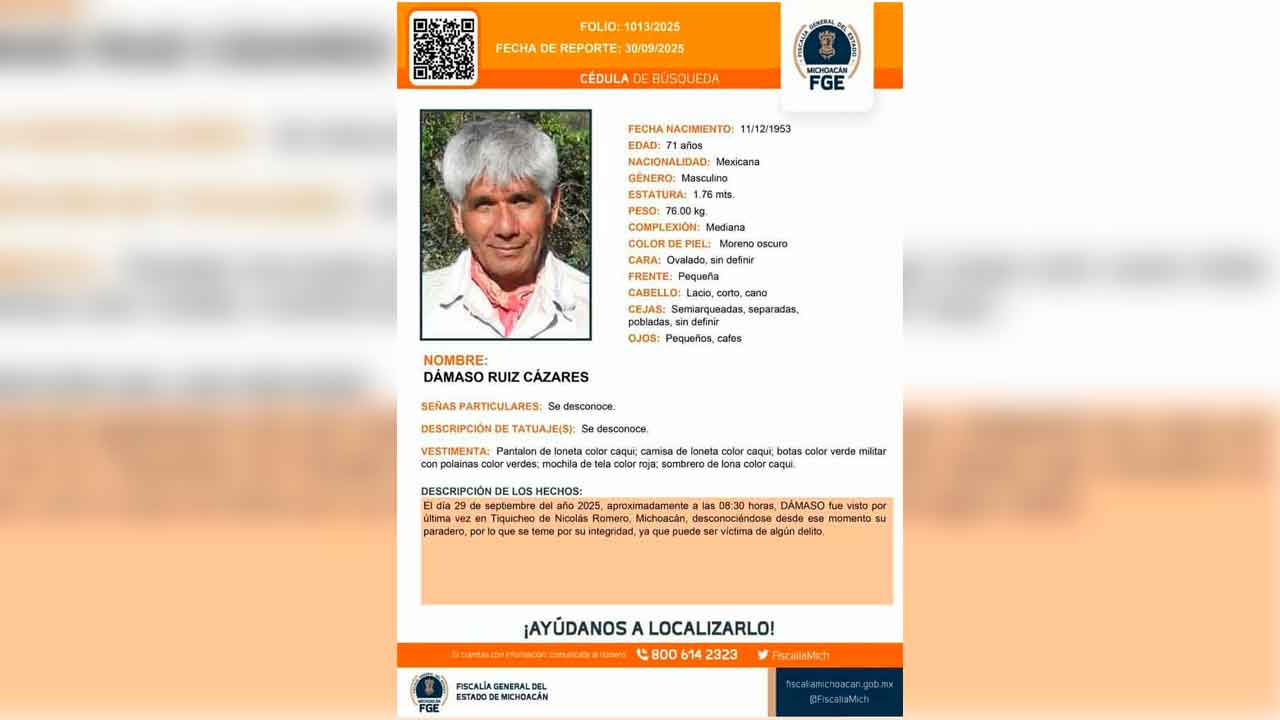 Tiquicheo, Mich.- Miércoles 01 de octubre de 2025.- Ya fue localizado con vida Dámaso Ruiz Cázares, senderista de 71 años de edad que había sido reportado desaparecido desde el pasado 29 de septiembre en una zona boscosa de la cabecera municipal de Tiquicheo.