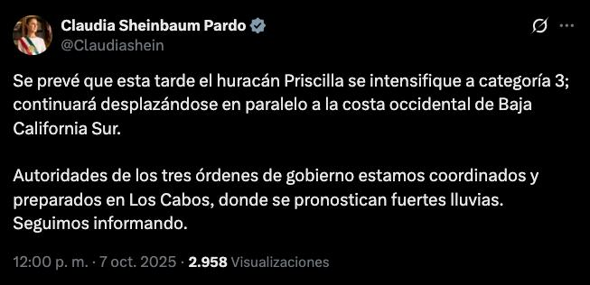 La presidenta Claudia Sheinbaum Pardo advirtió sobre el fortalecimiento del huracán Priscilla, que este 7 de octubre de 2025 se encuentra en aguas del Pacífico mexicano. La mandataria informó que los tres niveles de gobierno se mantienen en alerta y en coordinación ante su posible intensificación.