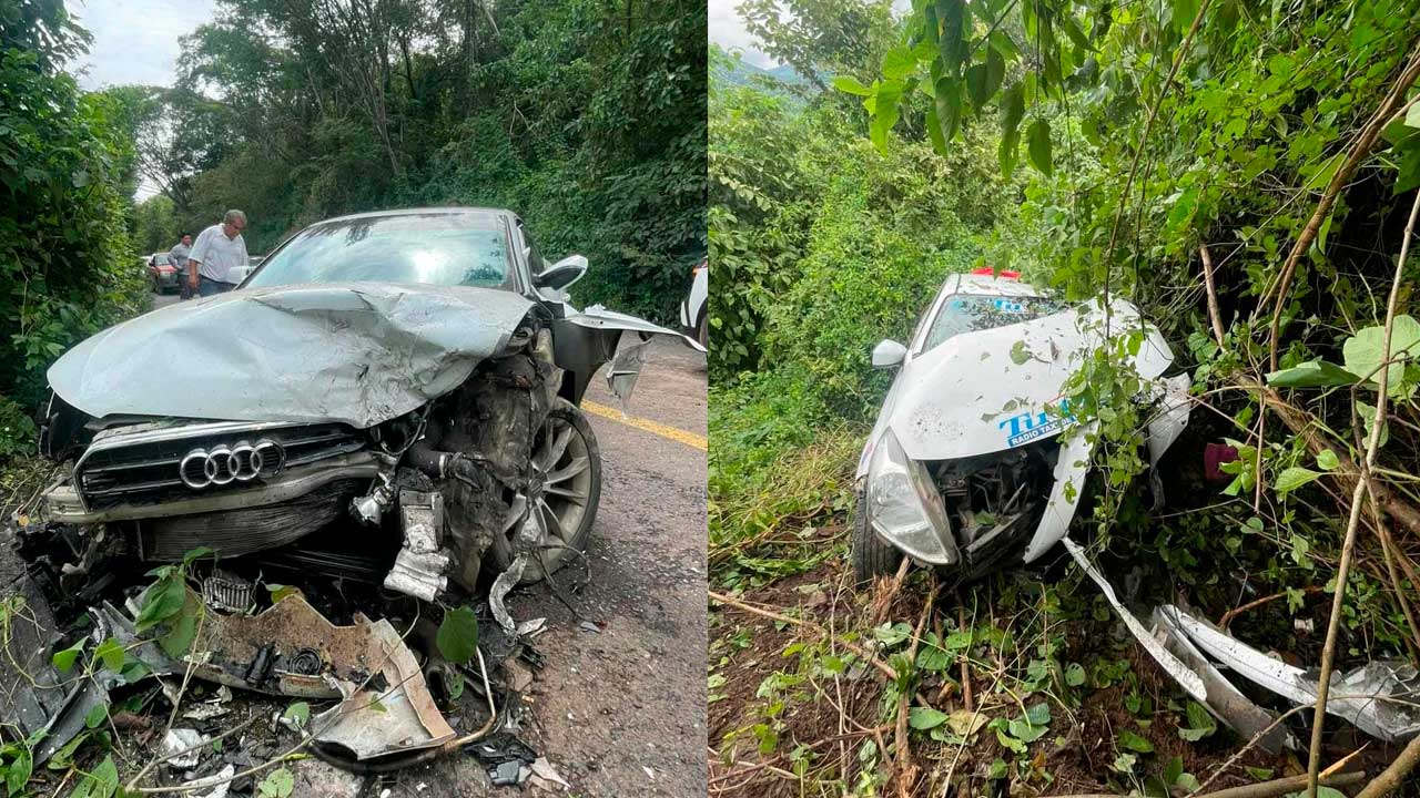 Huetamo, Mich.- Miércoles 08 de octubre de 2025.- Un muerto y tres heridos de gravedad fue el saldo que dejó un choque frontal entre taxi y un vehículo Audi A4 sobre la carretera Huetamo-La Eréndira, indicaron autoridades policiales y de rescate.