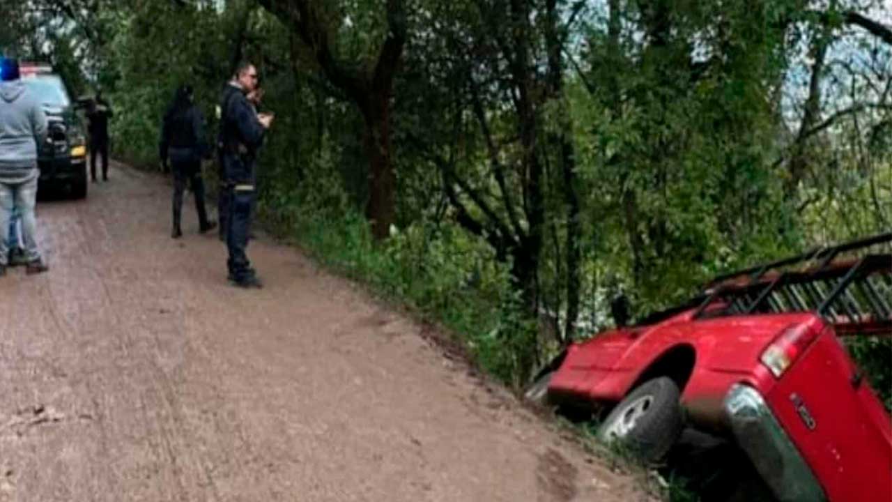 Morelia, Mich.- Jueves 09 de octubre de 2025.- Una camioneta roja que circulaba sobre un estrecho camino de terracería quedó parcialmente volcada tras caer a un desnivel, en las inmediaciones de la Antigua Carretera a Pátzcuaro y la Ciclovía, en Morelia, indicaron fuentes allegadas al tema.