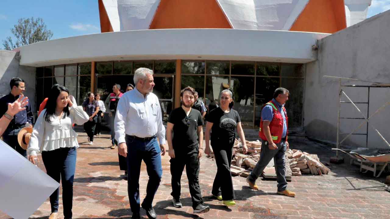 La secretaria explicó al gobernador los trabajos terminados como la demolición en fachadas, aulas de idiomas, oficinas administrativas, auditorio, pasillo de servicio, casa de la tierra, entre otras áreas; el desmontaje de la sala de proyección, que mantendrá el domo original. Así como los que se encuentran en proceso.