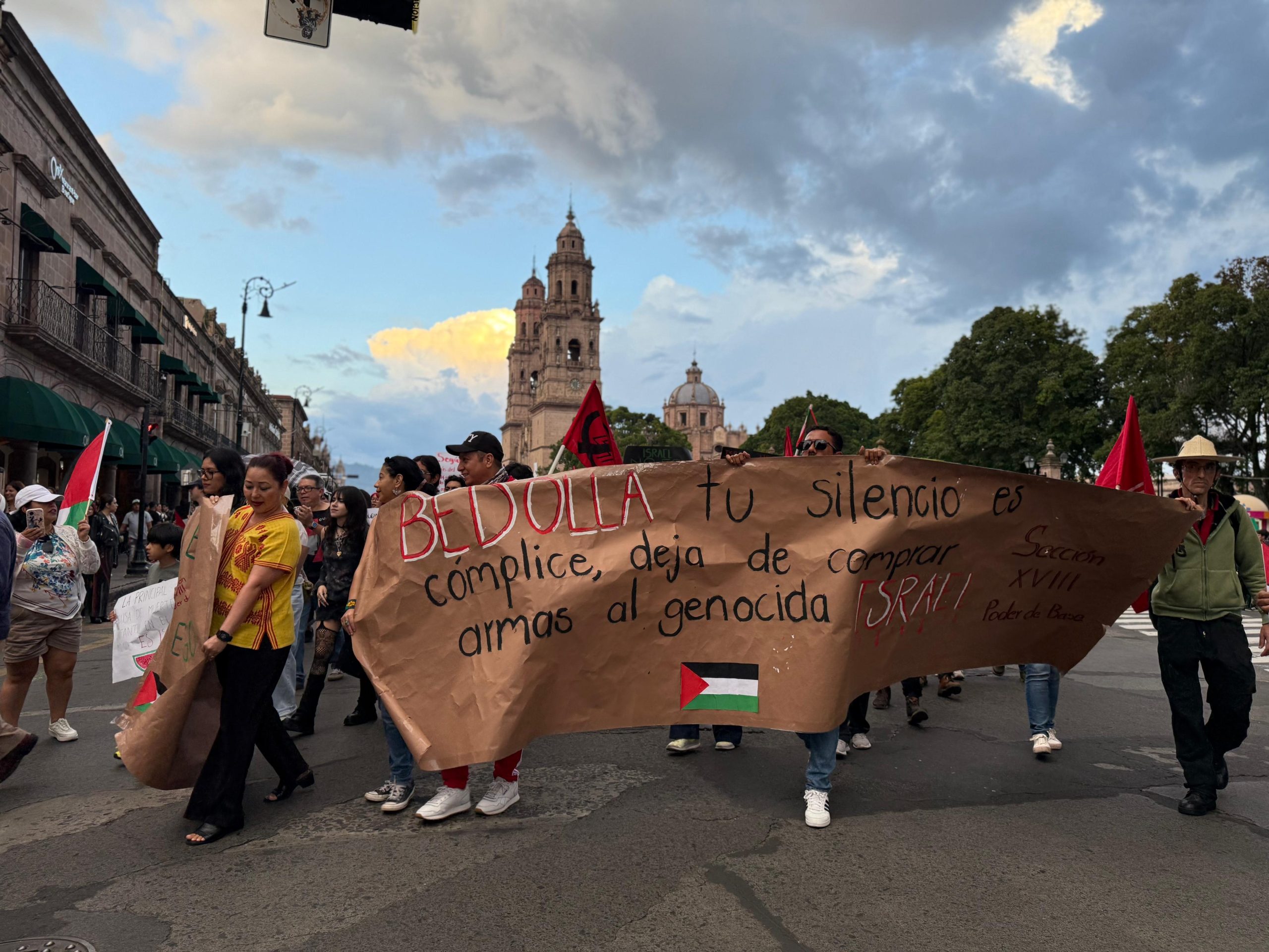 En un acto de solidaridad con el pueblo palestino, ciudadanos de Morelia se manifestaron hoy en el corazón de la ciudad para denunciar enérgicamente el “genocidio” que afirman, se está perpetrando en Gaza; la protesta se desencadenó tras la inspiradora visita de Nadia Rashin, embajadora de Palestina en México, quien ofreció una conferencia magistral en el Palacio Clavijero, el pasado 07 de octubre, donde expuso la cruda realidad que se vive en la franja de Gaza, “Más que un discurso se deberían de tomar acciones concretas” afirmó la diplomática.