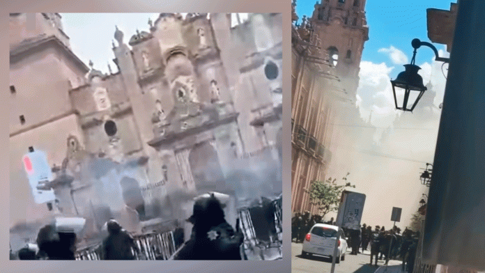 Morelia, Mich.- Domingo 12 de octubre de 2025.- Encolerizados integrantes del Frente Nacional de Lucha por el Socialismo (FNLS) se apoderaron de los dos camiones tranvías turísticos y uno de ellos lo dirigieron contra elementos de la Unidad de Restablecimiento del Orden Público (UROP), esto en pleno Centro Histórico de Morelia.