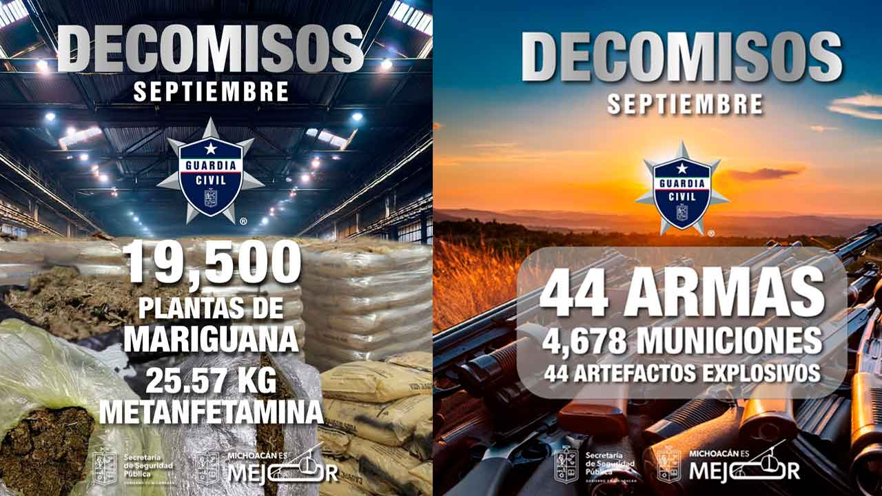Morelia, Michoacán, 13 de octubre del 2025.- Durante el mes de septiembre en Michoacán, la operación interinstitucional diaria de la Secretaría de Seguridad Pública (SSP), logró el decomiso de 44 armas de fuego, más de 4 mil cartuchos útiles, así como 25 kilos de metanfetamina.