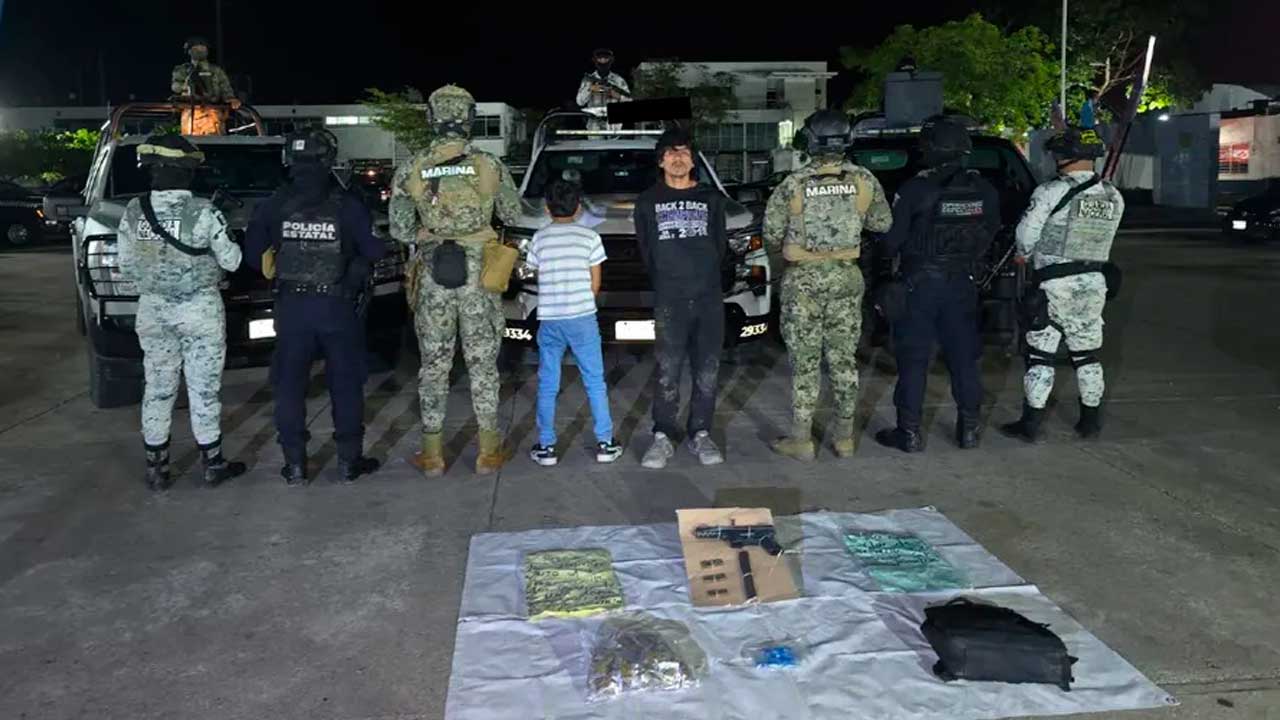 Tabasco.- Un menor de 14 años de edad fue detenido durante un operativo el domingo pasado, junto a otro hombre, de 37 años de edad, luego de que se les localizara droga, armas largas con cartuchos útiles y cartulinas con mensajes amenazantes.
