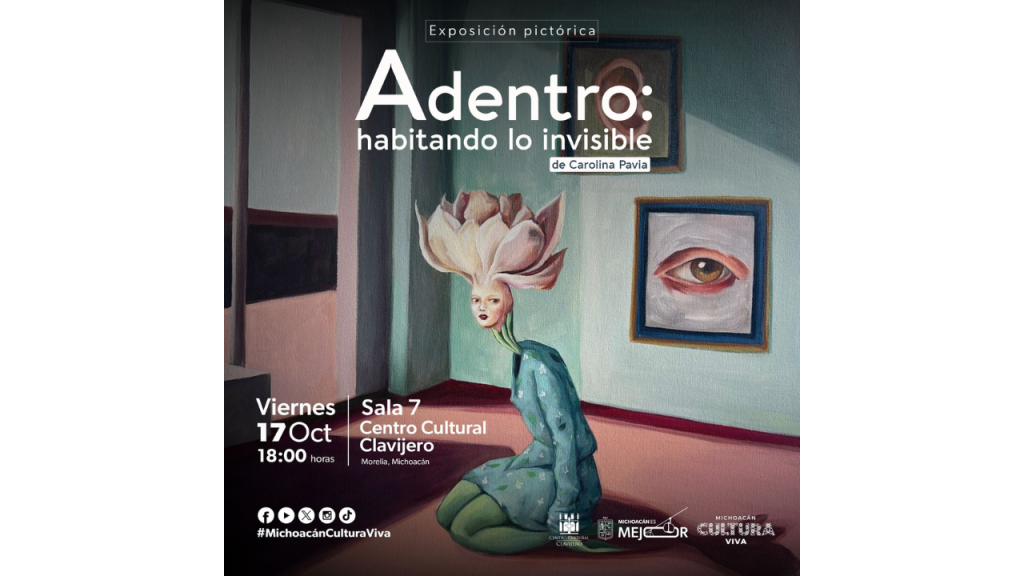 La Secretaria de Cultura de Michoacán presenta la exposición “Adentro: habitando lo invisible” de la artista Carolina Pavia, la inauguración se realizara el dia 17 de octubre a las 18:00 horas en la sala 7 del Centro Cultural Clavijero.