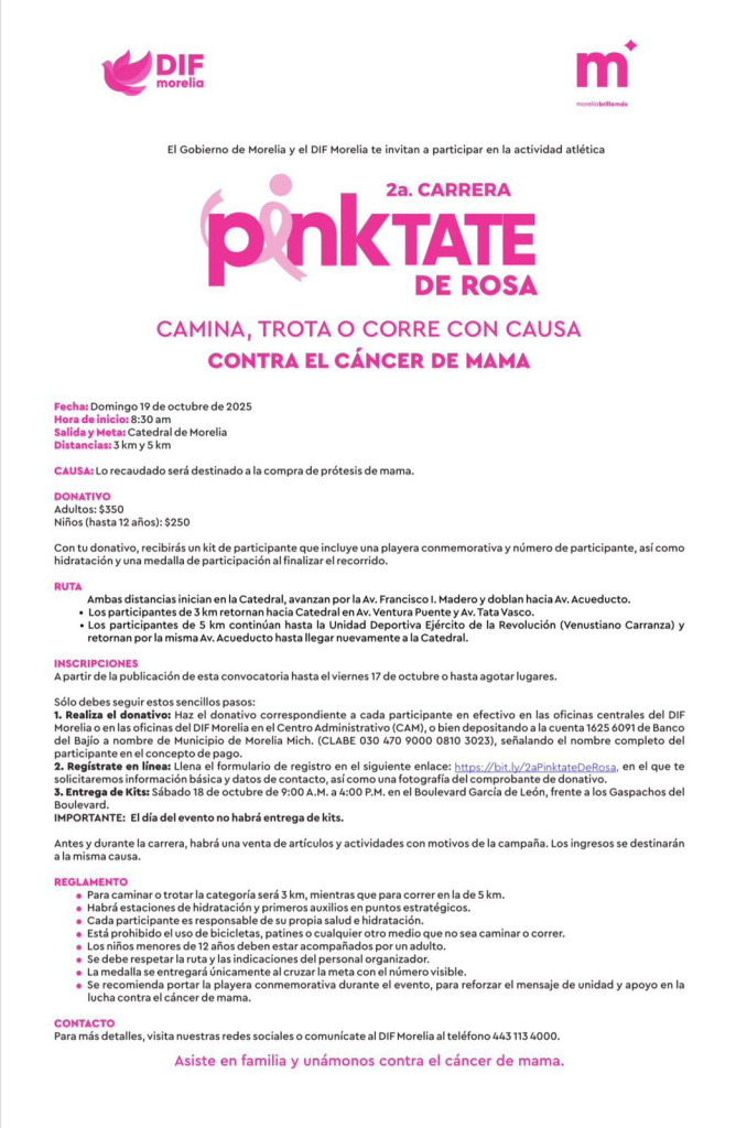 El próximo domingo 19 de octubre de 2025, Morelia será sede de la 2ª Carrera Pinktate de Rosa, un evento deportivo y solidario que busca apoyar a mujeres que enfrentan el cáncer de mama. La salida y meta será en la Catedral de Morelia, con recorridos de 3 y 5 kilómetros, ideales para correr, trotar o caminar en familia.